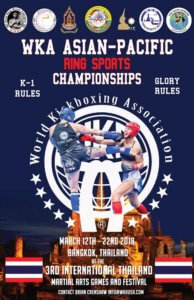 WKA Asian-Pacific Ring Sports Champs. Open to all countries. K1 and Glory Rules in Thailand for kids and adults. Get in contact today to take part in this great event. Come and meet senior members of the WKA, see how we can help you be part of the oldest and most respected association in the world. Mr. Brian Crenshaw and Mr. Dave Sawyer will be in attendance on behalf of our World president Paul Ingram. For entries email info@wkausa.com