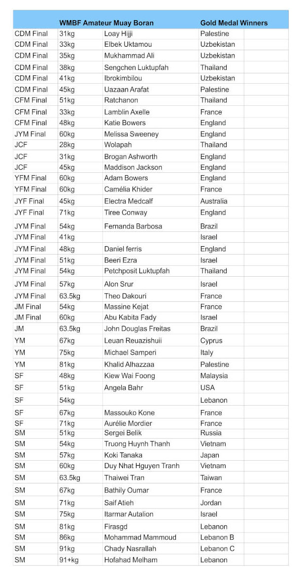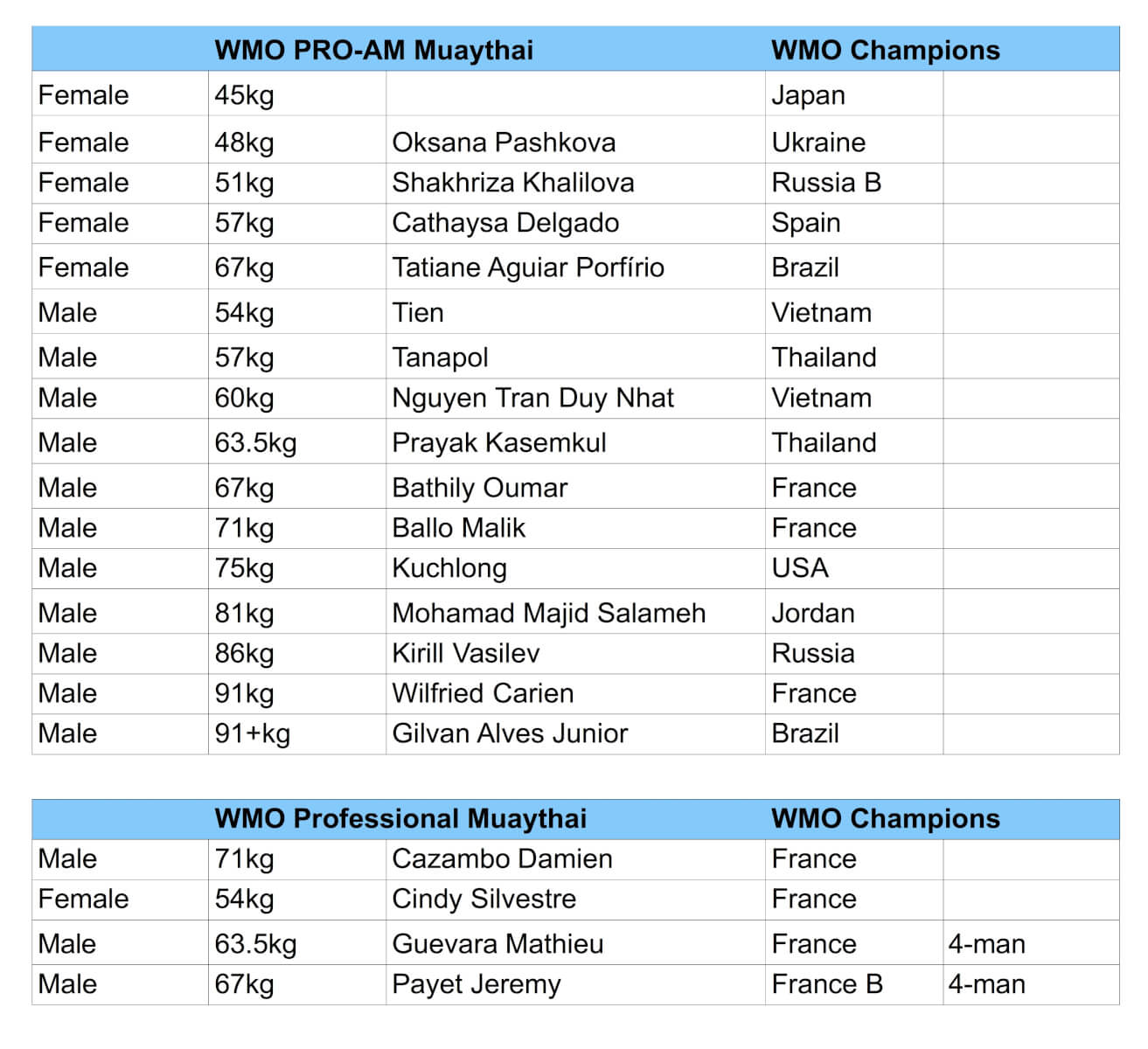 WMBF – Amateur Muay Boran WMO PRO-AM + Professional Muaythai WKA Kickboxing Results WKA Kickboxing – K1 Rules WKA Kickboxing – Glory Rules Carlson Gracie International Cup